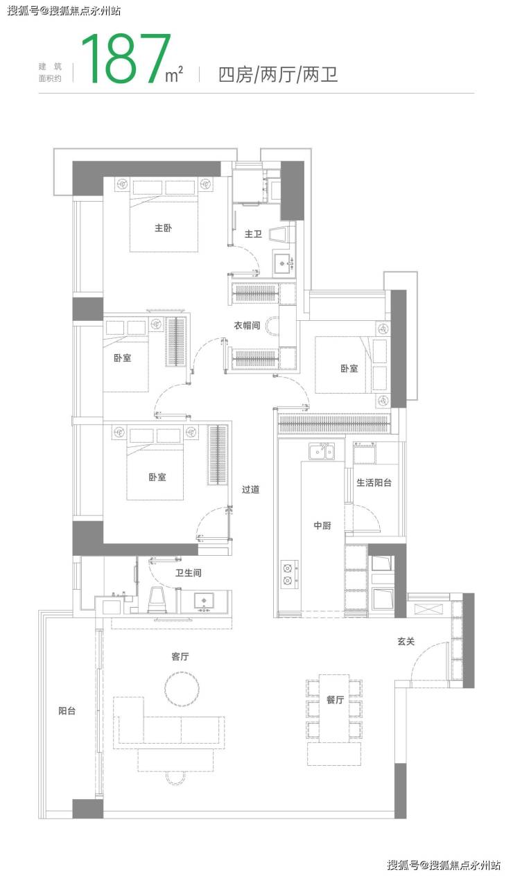 187㎡户型:横向创新户型,超宽向阳尺度,吸纳阳光新风。主卧私享化,独立卫浴、衣帽间,自在天地一隅。四开间朝南,卧室大飘窗,在阳光中享受美好栖居。南北双阳台,一面晾晒收纳,一面休闲享受。