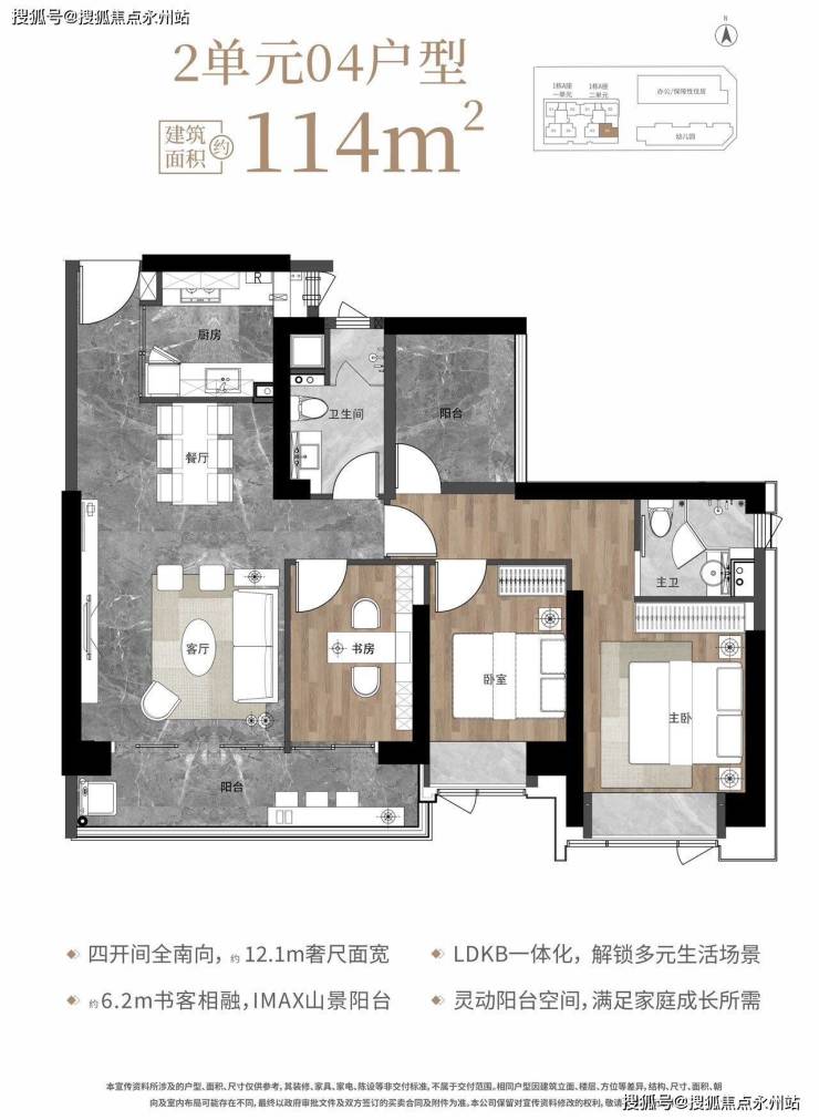 114㎡四房两厅两卫(1栋2单元04户型)四开间朝南,面宽达12.1米,客厅连接次卧形成6.2米超长观景阳台,正南朝向无遮挡,可同时俯瞰梧桐山、深圳河及香港打鼓岭景观。