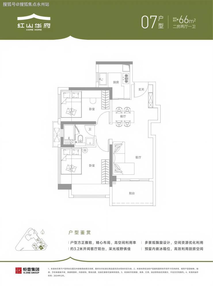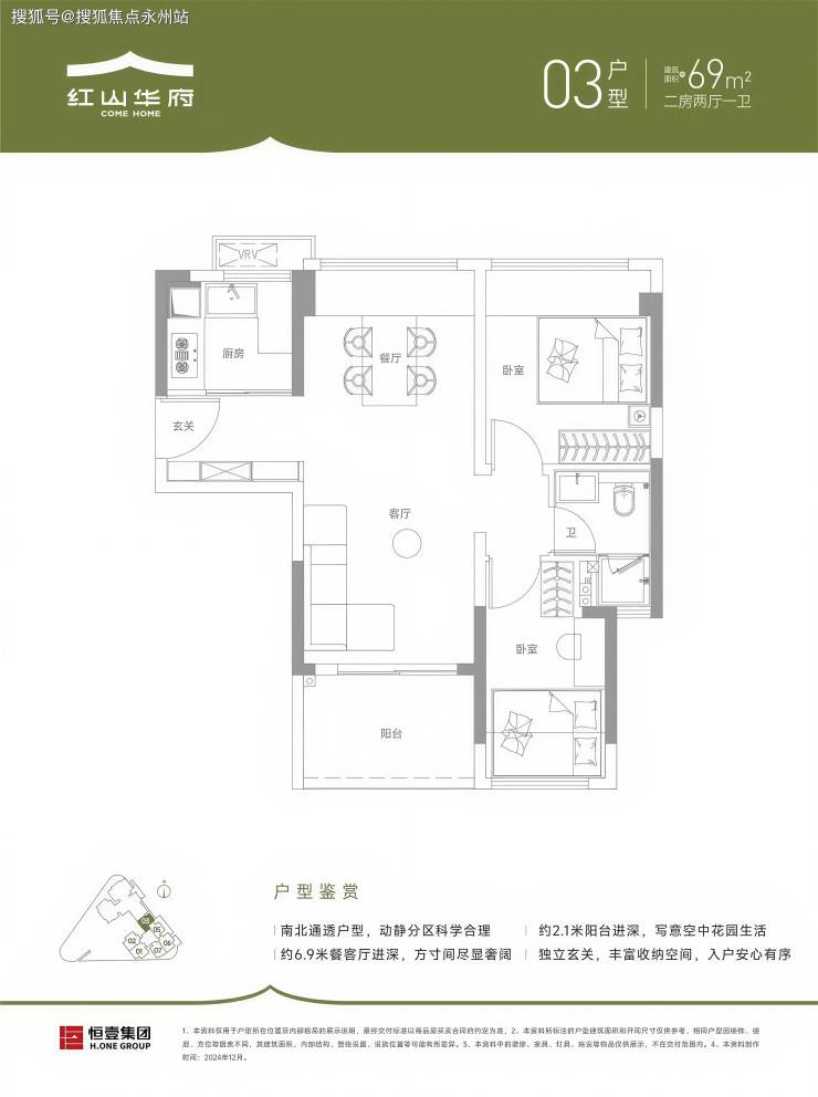 布局特点:竖厅带独立玄关,餐客厅进深6.9米,可灵活改造为“2+1”房。