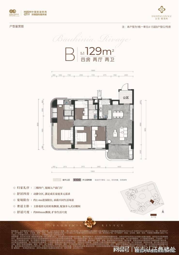 B户型 (1栋一单元4-13层) 建筑129m²四房两厅两卫,设计亮点包括:三梯四户、动静分区设计、约2.4米进深阳台、主卧配备弧形转角飘窗及步入式衣帽间、约800毫米飘窗。