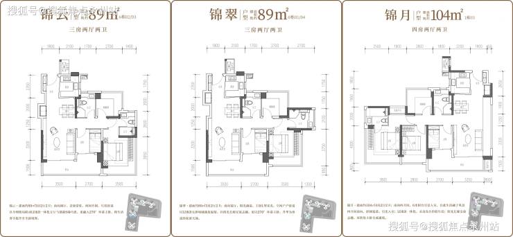 户型包含88㎡竖厅3房2卫,104-106㎡竖厅4房2卫,107㎡为双龙抱珠4房2卫,127-130㎡通透4房2卫。