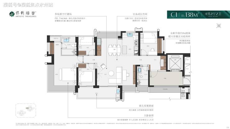 138㎡4+1房2卫,南北通透看海景,设计的是横厅南北通透格局,独立专梯入户,送约12㎡的私用公区,客厅5.7米开间,LDKB一体化,四开间朝南,4个卧室分别做到了主卧25.7㎡/次卧8.91㎡/次卧8.64㎡次卧7.29㎡(包含墙体飘窗),客厅连接次卧出6.3米长的瞰海大阳台,L型岛台式厨房,卫生间干湿分离,套内面积107.64㎡+赠送29.43㎡(不含公区),加上得房率约99.32%。