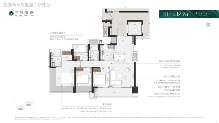 123㎡4房2卫,西南向看海景,设计的是竖厅格局,独立专梯入户,送约6㎡的私用公区,客厅4.2米开间,LDKB一体化,S墙设计预留冰箱卡槽位,动静分区,四开间朝南,4个卧室分别做到了主卧23.1㎡/次卧11.2㎡/次卧8.64㎡/次卧6.25㎡(包含墙体飘窗),客厅连接次卧出6.9米长的瞰海大阳台,L型岛台式厨房,卫生间干湿分离,西南朝向看海景。套内面积95.94㎡+赠送18.12㎡(不含公区),加上得房率约92.73%。
