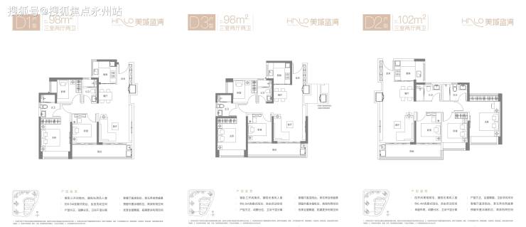 D3户型-98㎡的3房2厅2卫,设计的是竖厅格局,其实整个室内布局是跟D1户型一模一样的,只不过朝向更佳,全部都是东南朝向。