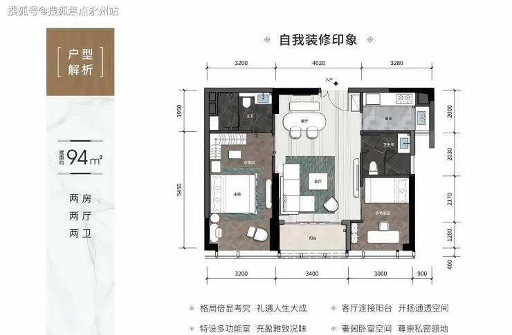 公寓94㎡2房2厅2卫:双龙抱珠,户型方正,实用率高,94平做到两房两卫,市场少有的产品,厅出阳台,3.15米层高,通燃气,舒适宜居,空间通透,卧室奢阔且私密。