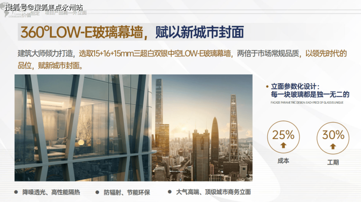 兆鑫深南上玺,对标世界一线城市摩天大楼豪宅大平层设计,幕墙均采用超于市场常规品质两倍的15+16+15mm三超白双银中空LOW-E玻璃。使得产品隔音性能提升30%、通透性增至25%、自暴率降至70%立面采用参数化设计,成本增加25%,工期延长至30%;每一块玻璃都是独一无二的。