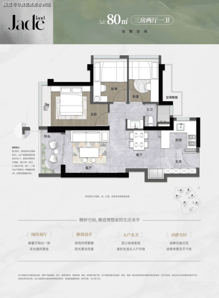 建面80平:3房2厅1卫,传统的竖厅动静分区格局;S墙设计预留冰箱位,U型厨房,卫生间三段式分离设计,符合当下户型设计的主流;承重墙没有凸起,所有的房间飘窗很好利用;紧凑的刚需三房,功能齐全,80平米只有一个卫生间没有什么好吐槽的;所有户型均是西北朝向,好的朝向都做成了大户型,唯一考虑的是两个次卧可以选择东南或者西南朝向