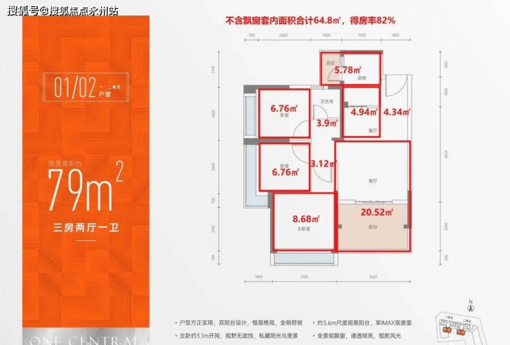 这个户型套内面积(不含飘窗)大概计算为64.8㎡,整体得房率82%,含飘窗会更高。