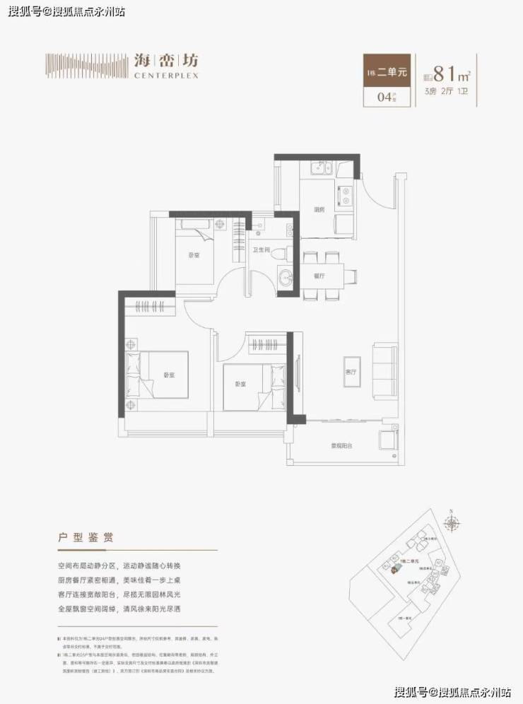 约81㎡三房一卫(1栋2单元04户型)竖厅格局,餐客一体,动静分区结构,东南朝向,看小区花园,但是2单元与5单元仅有41米的楼间距,高楼层存在一定的压抑感。