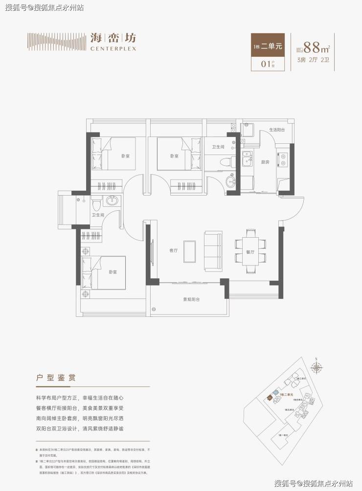 约88㎡三房两卫(1栋2单元01户型)横厅南北通透格局,餐客一体,厨房带1个生活阳台,主阳台东南朝向,但餐厅位置受楼栋设计原因,有遮挡。