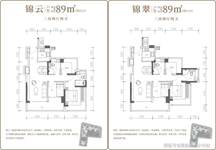 建面约89㎡三房两厅两卫:项目的主力刚需户型,共有两种变体(01/04、02/03 户型),主要差异在于次卧及主卫布局