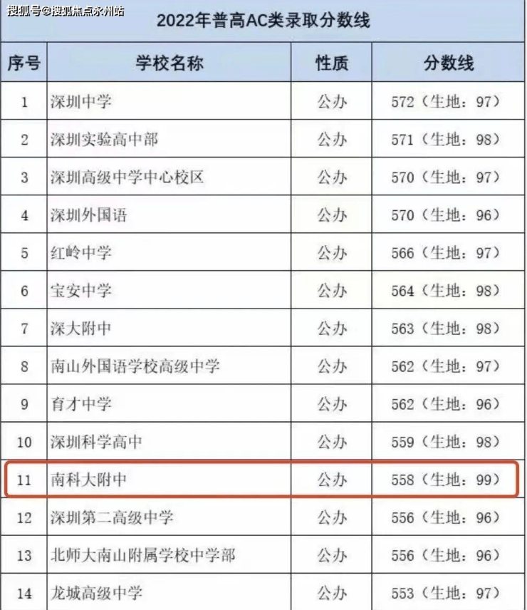 2022年2022年7月26日,深圳市2022年中考录取分数线公布。南方科技大学附属中学录取分数线为AC类558分,位列深圳市第11名;D类554分,位列深圳市第10名。超过部分四大八大老牌名校,跻身深圳一线名校行列。
