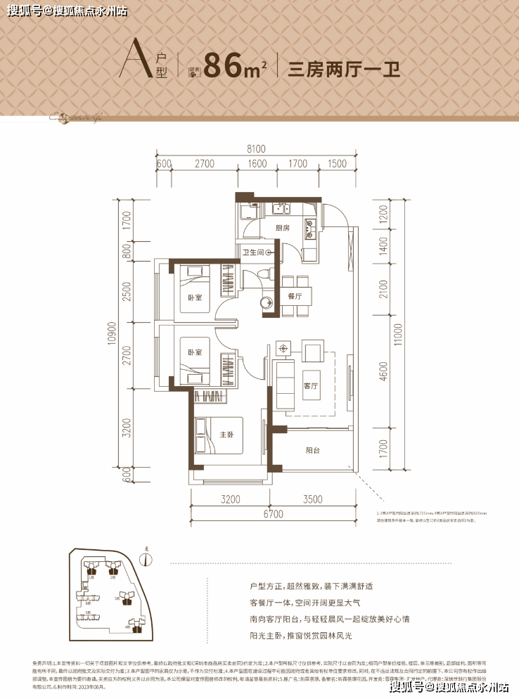 项目于2023年10月18日取证入市,推出543套房源,面积86㎡的3房1卫,96㎡的3房2卫,143㎡的5房2卫户型,备案均价4万/㎡,备案单价3.55-4.33万/㎡,总价309-600万/套,2024年底毛坯交房。