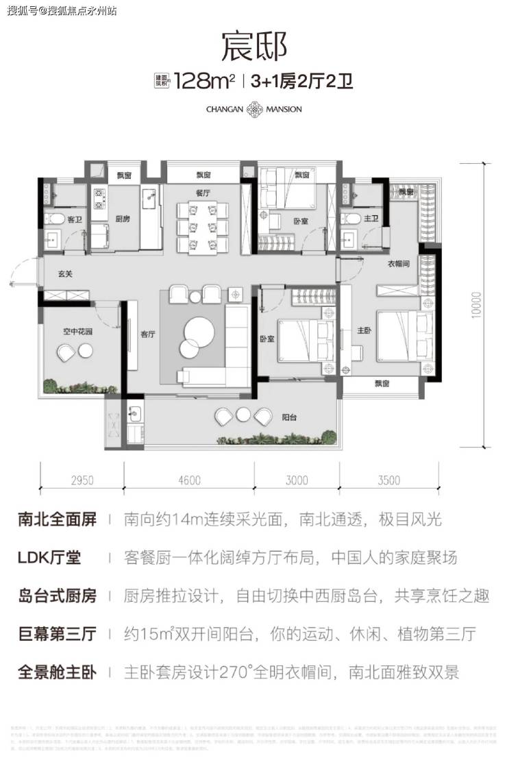 宽幕采光通风:南北全明设计,约14米采光面覆盖公区与主卧,搭配双开间阳台,实现双面宽通透。