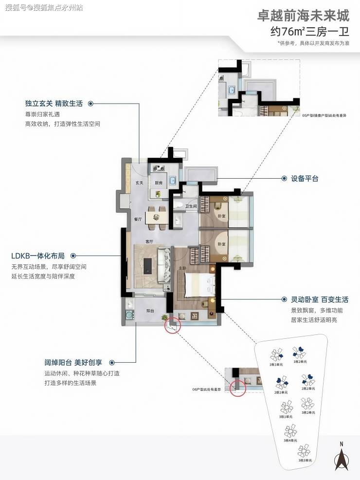 76㎡明星三房:三段式卫生间(洗手台外置),设备平台可改造为家政间,南北双阳台设计,主卧 2.95 米开间,满足三代同堂需求4。