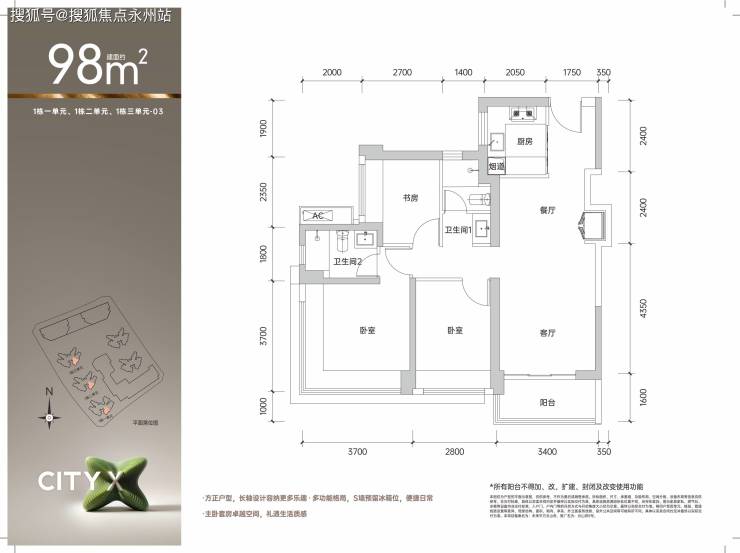 98㎡三房两厅两卫:(舒居三口之家首选) 空间奢阔静谧舒居 全南向客厅及卧室 公卫干湿浴三分离 主卧270°巨幅视野。