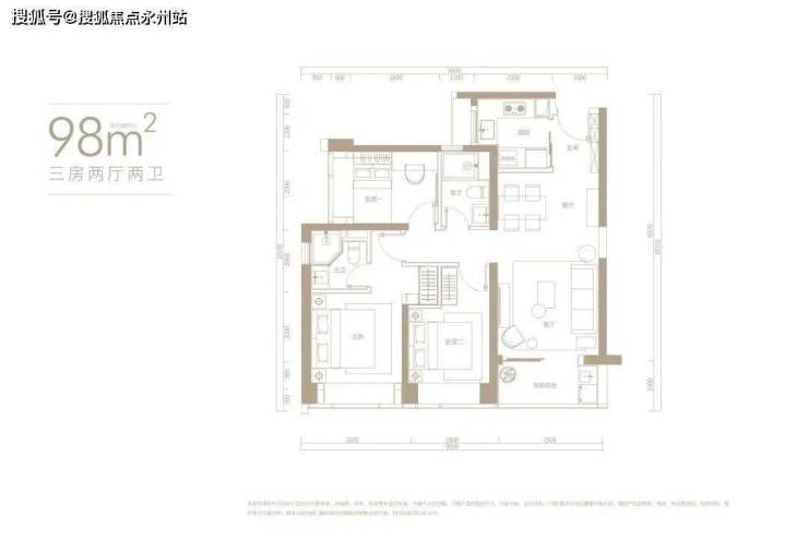 建面约98㎡三房两厅两卫