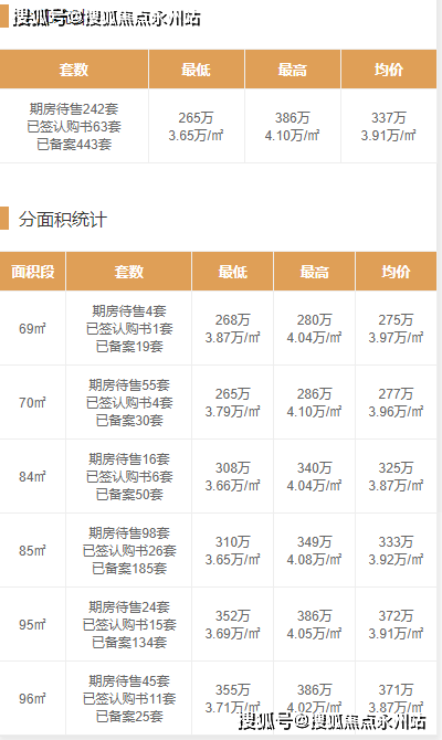 项目于2022年9月16日取证入市,共748套房源,面积69㎡的2房2厅1卫,85㎡的3房2厅1卫,96㎡的3房2厅2卫户型,备案均价3.91万/㎡,备案单价3.65-4.1万/㎡,总价265-386万/套区间,计划于2025年3月底带精装交房