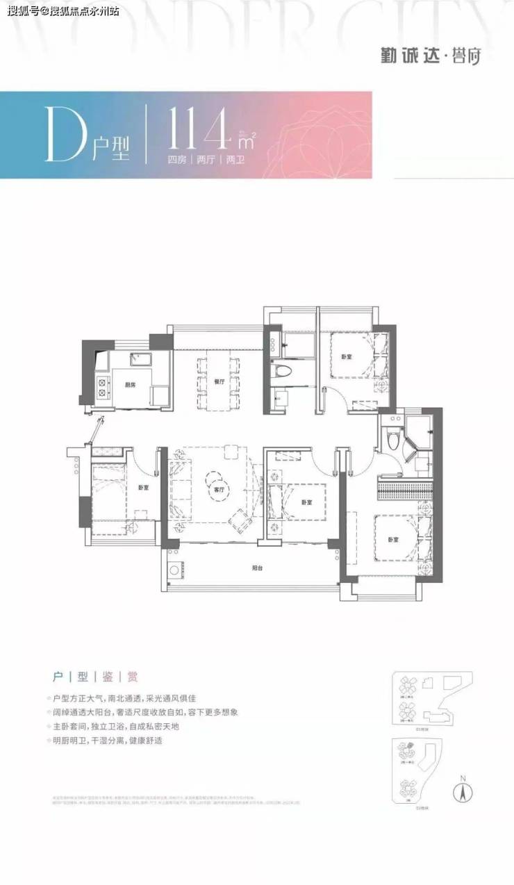 114㎡的4房2厅2卫,设计的是竖厅南北通透格局,四开间朝南,客厅连接次卧出大阳台,U型厨房,公卫三段式分离,得房率72.57%(不含赠送),阳台主朝东南向。
