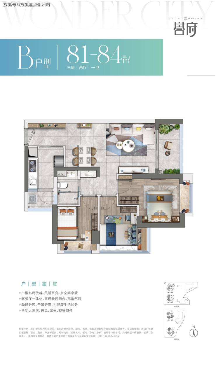 81-84㎡的3房2厅1.5卫,设计的是竖厅格局,客厅3.2米开间,一字型厨房还带一个小生活阳台,卫生间干湿分离,得房率74.4%(不含赠送),有西北、西南或东南朝向。