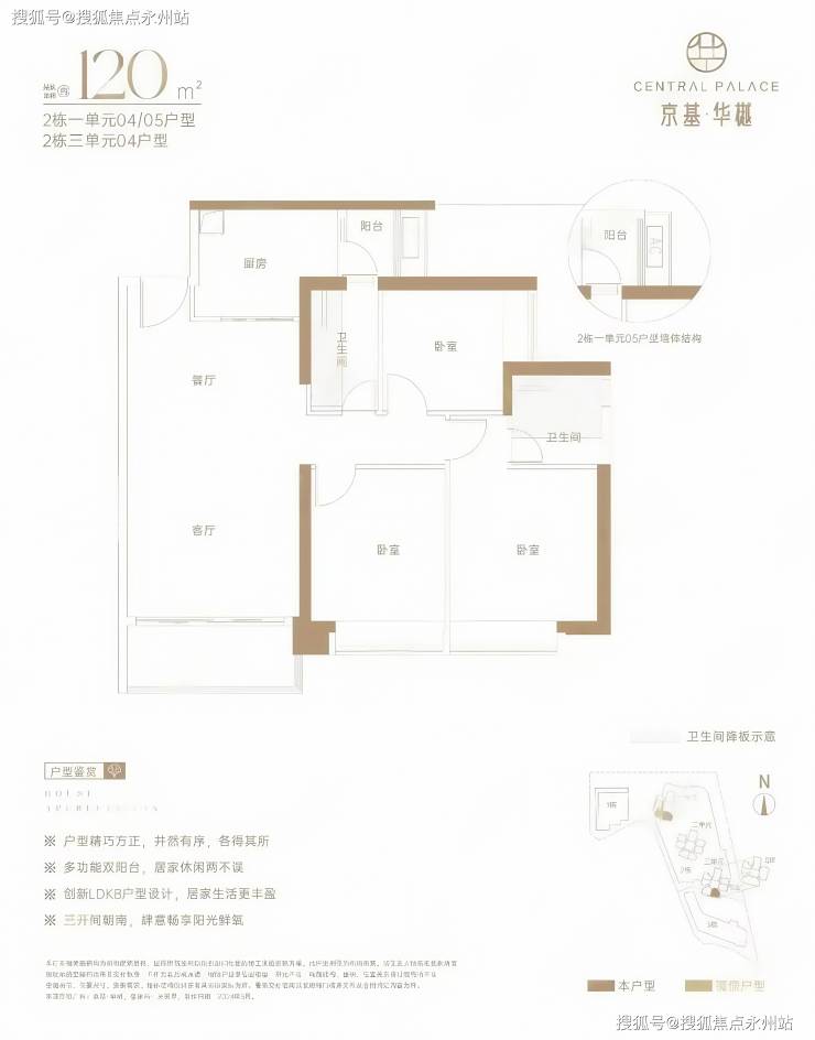 建面约 120㎡ 三房两厅两卫:经典竖厅格局,LDKB 一体化设计,三开间朝南,L 型厨房带生活阳台,卫生间干湿分离。全屋飘窗设计,拓展空间利用率。阳台西南朝向,视野开阔。