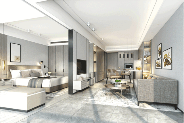 42㎡1房小空间,也打造有足够多的收纳空间,让高端商务人士短暂忙碌的差旅生活也有条不紊,从容、精致。