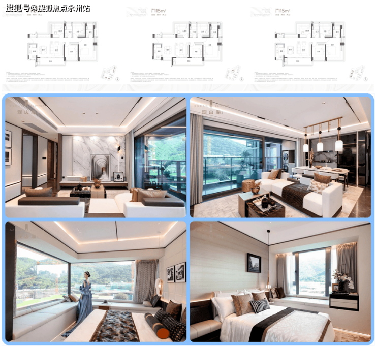 建面约115㎡4房2厅2卫(分布在1-1栋/1-2栋/1-3栋的01、02户型和2-1栋/2-2栋/2-3栋的01、02、03户型,分别朝西南向远眺小南山山景,和东南向远眺大南山山景)东南或西南朝向以及西北朝向,横厅设计,270°宽景飘窗,阳台也非常宽敞。