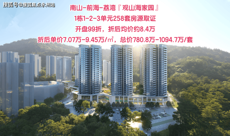 1栋1-2-3单元258套房源取证:位于南山区南山街道前海荔湾板块的『观山海家园』1栋1-2-3单元258套房源取证入市,项目为单个地块,占地约4.2万㎡,建面约16.3万㎡,由12座高层住宅楼+裙房组成,此次为该项目首批发售房源,后续还会有9座住宅,约612套货量分多批次陆续加推。(深圳远洋观山海售楼处电话:400-992-0669)