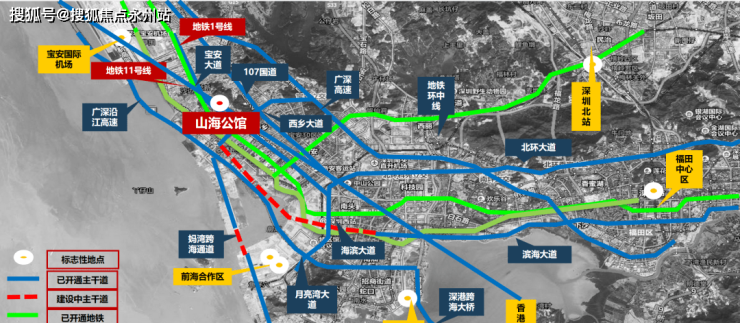 交通配套方面,山海公馆享有 “海陆空轨铁”五维交通体系。海路上,紧邻大铲湾码头和福永码头;陆路占据四横三纵的格局(四横:广深高速、沿江高速、107国道、宝安大道。三纵:西乡大道、航城大道、机场南路);空港交通,项目到达宝安国际机场约10分钟车程;轨道交通,项目东南约600米直达穗莞深城轨西乡站(预计2025年通车);铁路交通,机场东高铁站(规划)和深茂铁路(在建)的建成将弥补西部片区铁路交通的缺失,片区交通体系将更加完整。