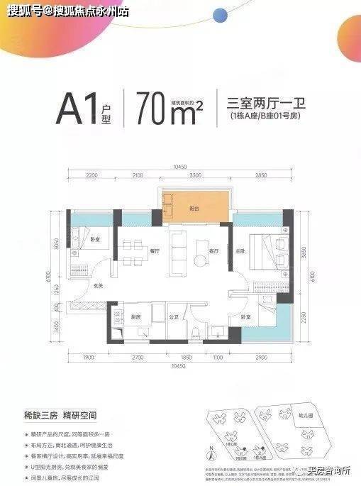以约70m²3房为例,在控制总价前提下,相比于市面同等面积2房产品多一房,优势很明显,约3.3米开间的客厅直连进深1.6米的阳台,空间感与阳光感都被无限放大;预留玄关收纳、冰箱位,270°转角飘窗,干湿分离设计,该有的舒适感和实用性,都被铺进了室内的每一个空间。
