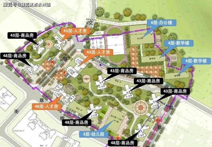 根据荔园片区城市更新单元的重建后效果图来看,共计规划10栋住宅(43-48层)和1栋幼儿园(3层),花园会分为西区和东区,两个区中间由规划道路--文翠街分开,上面设有连廊天桥互通。西区较小只有3栋住宅楼(其中1栋人才房/保障房),东区规模要大一些,有7栋住宅楼(其中2栋人才房/保障房)+1栋幼儿园建筑,主要的花园小区基础配套设施也都集中在东区。项目是带有裙楼商业的,但根据规划指标看商业面积很小。