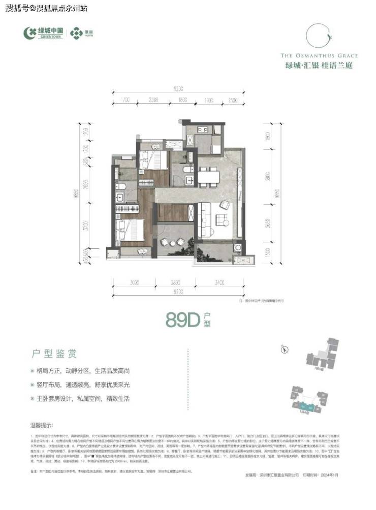 89㎡的3房2厅2卫(D户型),设计的是经典竖厅格局,餐客厅一体化,客厅3.4米开间,三开间朝南,3个卧室分别是3米/2.8米/2.3米的宽度,U型厨房,阳台1.5米进深,西南朝向。