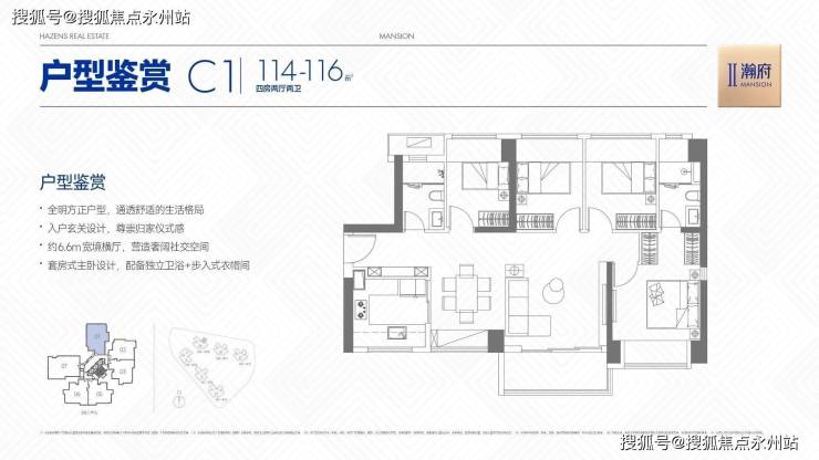114-116㎡4房2厅2卫01(C1)户型,设计的是横厅朝东南向,客餐厅开间6.6米,LDKB一体化设计,四开间朝南,全屋7面飘窗,主卧套房+步入式衣帽间,3个次卧朝西北向。