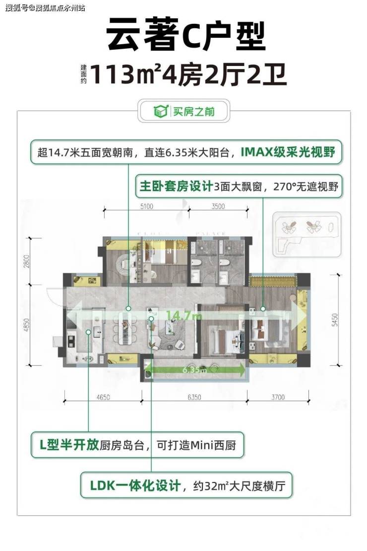 建面约113㎡4房,LDKB一体化设计下约32㎡的横厅,超14.7米的奢阔南向五开间,直连约6.5米的巨幕阳台。
