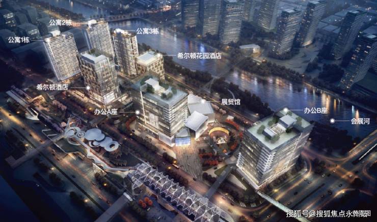 业态组成:3栋商务公寓(T1/T2/T3)、2栋办公写字楼(A/B座)、希尔顿星级酒店群、4.63万㎡产业展览馆及配套商业,实现“办公+会展+商务+休闲”一体化