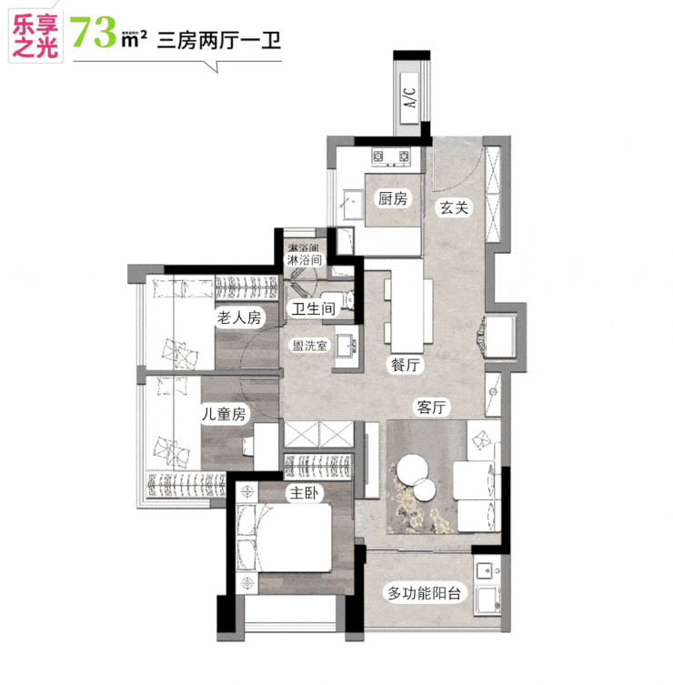 我们以建面约73㎡的三房户型为例,实用率超过80%,整体设计紧凑但不拥挤,动线合理,采光充足。