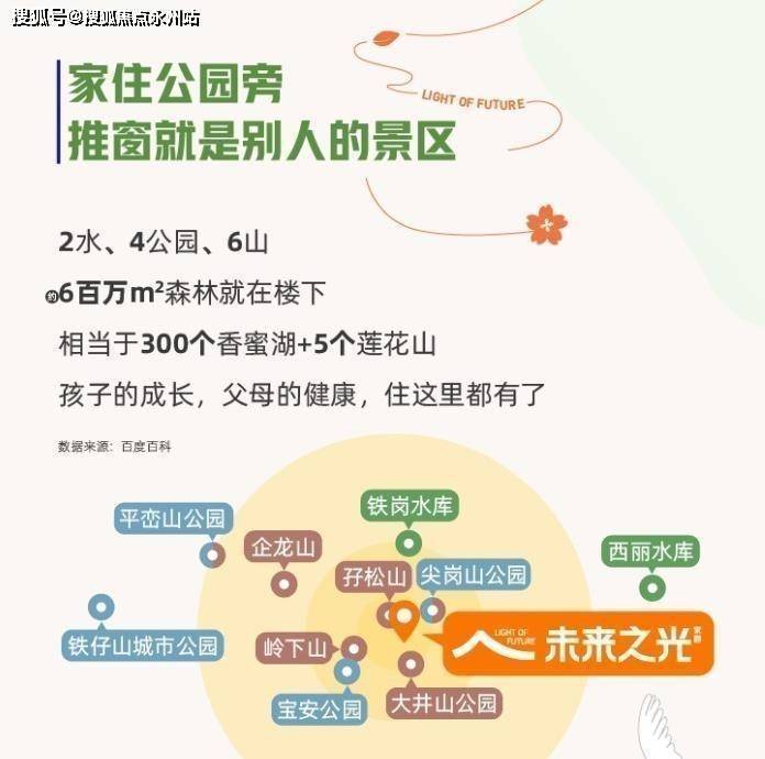 万科未来之光恰恰就是一座建在公园里的大城,项目周边的各种景观如果做一个汇总,可以归为6山2水4公园。