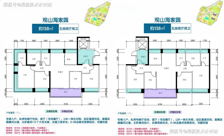 138㎡四房两卫(楼王户型):2梯2户纯板楼,南北通透,独立电梯厅可拓展为5房,得房率约94-97%,部分房源享270°一线山景,主卧套房带270°飘窗,折后总价1173-1270万/套。