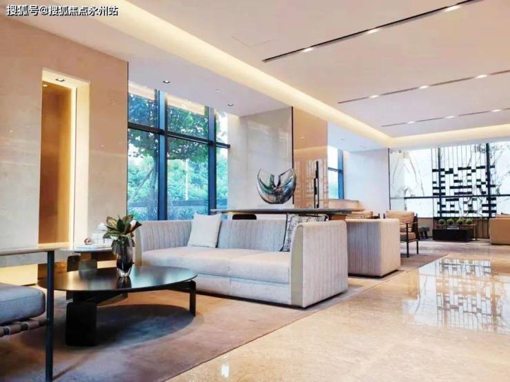 天健天骄首层大堂面积约 300㎡,在深圳大平层豪宅里并不逊色:米色大理石地砖和透光天然石材墙面,配上 3组沙发,显见轻奢风格。