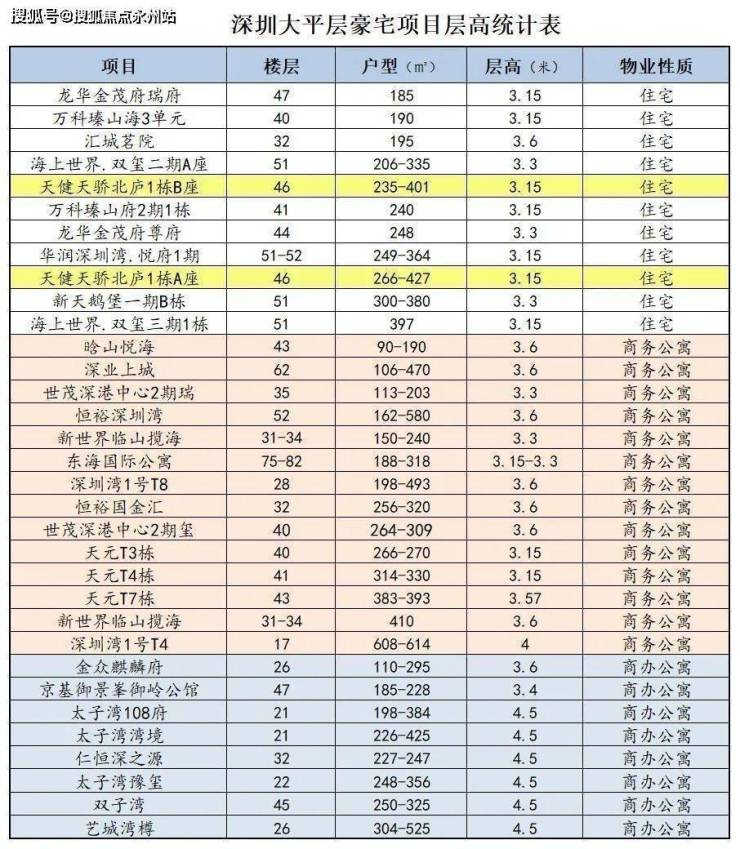 深圳的大平层豪宅户型的主流层高,商务公寓为 3.6米,商办公寓为 4.5米,住宅为 3.15米。天健天骄北庐户型层高均达到 3.15米。