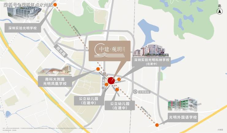 中建观玥名邸项目位置:光明区凤凰街道观光路与光侨路交汇处,紧邻地铁13号线德雅路站(步行约100米)及光明城高铁站(约800米)
