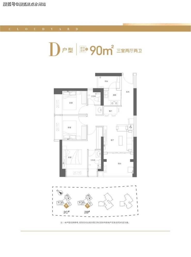 90平3房2卫——对称户型、正南朝向、次卧南向、南北双阳台、大面宽观景