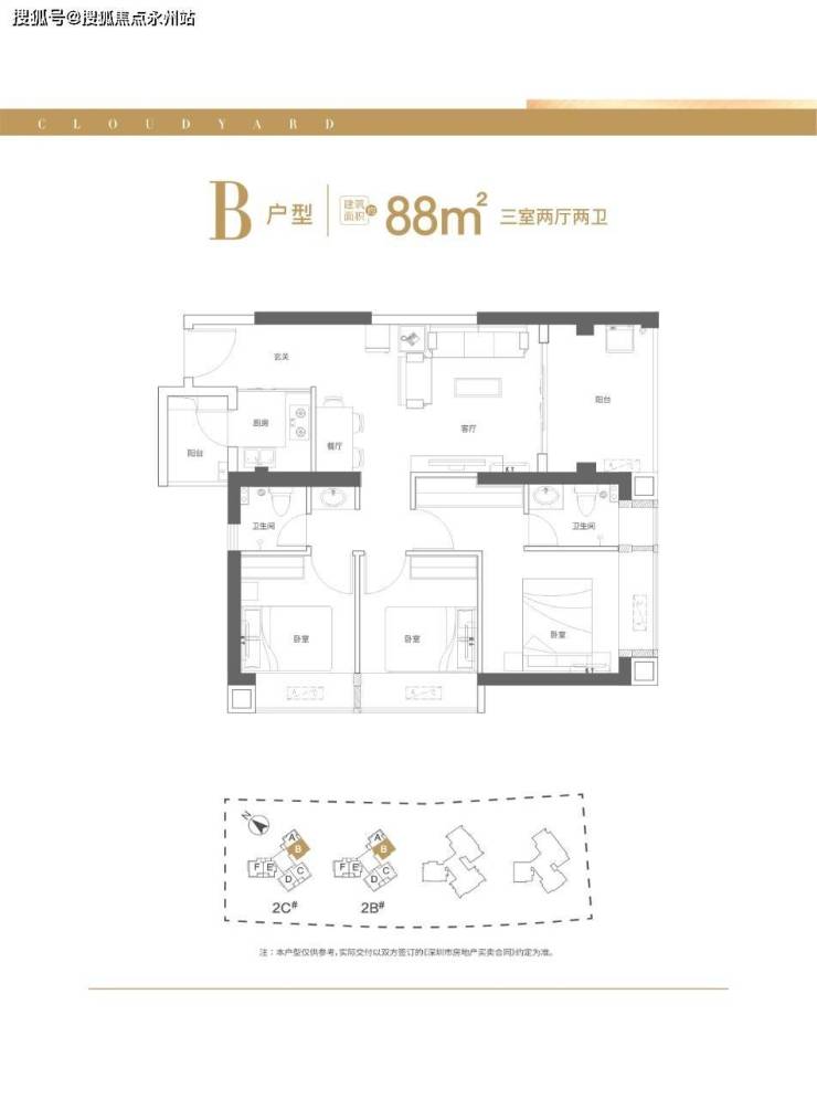 88平3房——关内真三房、对称户型、正南朝向,次卧南向、南北双阳台、大面宽观景