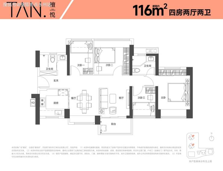 建面约 116㎡四房两厅两卫(南北通横厅)