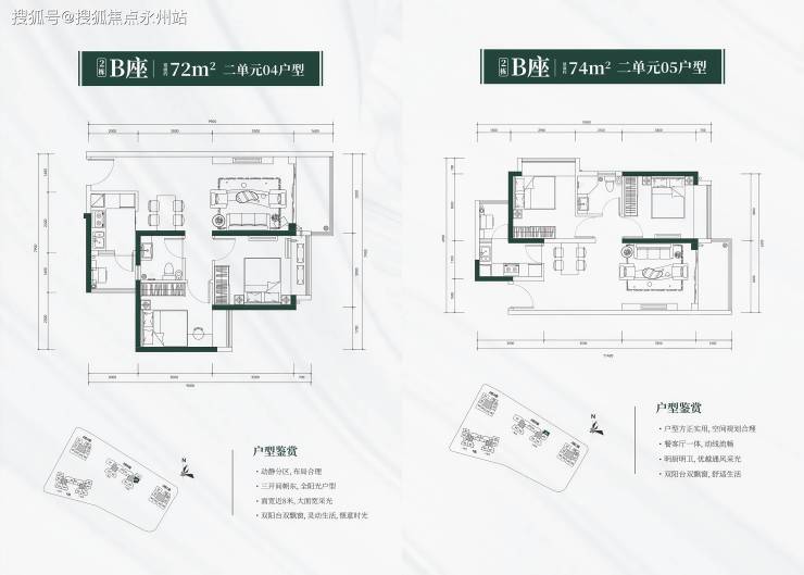 2栋B座二单元04/05户型:72-74㎡两房两厅一卫(东南/东向),共99套,占比约42.1%,为福田核心区罕见小户型。