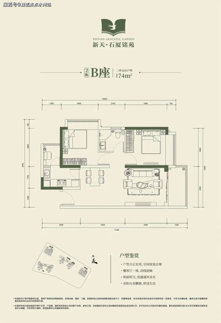 2栋B座二单元04、05户型:面积约为72-74㎡的2房2厅1卫。