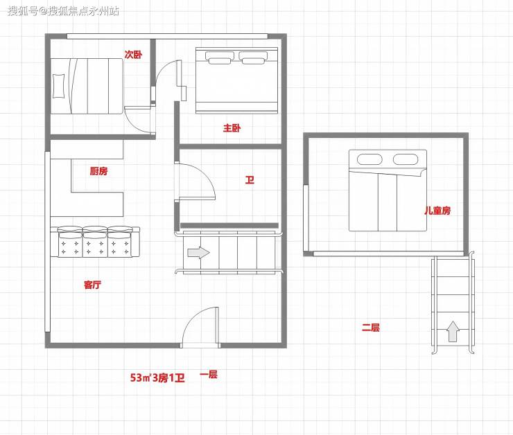 建面约53㎡三居室:层高3.6米,采用“竖厅+三卧”设计,主卧与次卧均配备飘窗,书房可灵活改造为儿童房或储物间。
