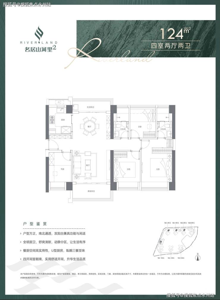 124㎡四室两厅两卫,设计的是南北通格局,客厅3.5米开间,南北通透双阳台,四开间朝南,全屋飘窗,U型厨房,得房率:71.36%(不含赠送),阳台1.5米进深,主朝东南向。