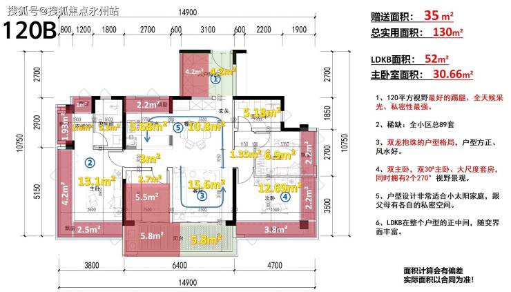 A 户型:南北对流的 LDKB 洄游大方厅设计,主卧面积约 30㎡,配备双洗手盆卫生间。