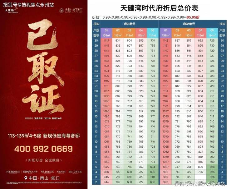基础折扣:综合85.9折优惠,折后均价6.98万/㎡,折后单价5.44-8.27万/㎡,4房总价624万起,5房总价942万起,